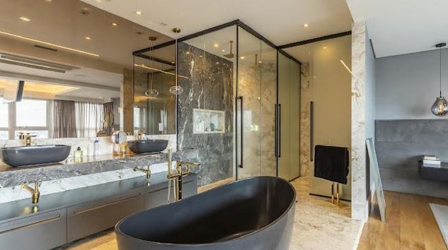 banheira, pias e chuveiros duplos.