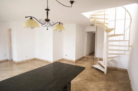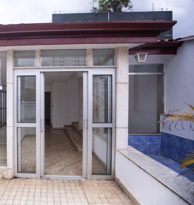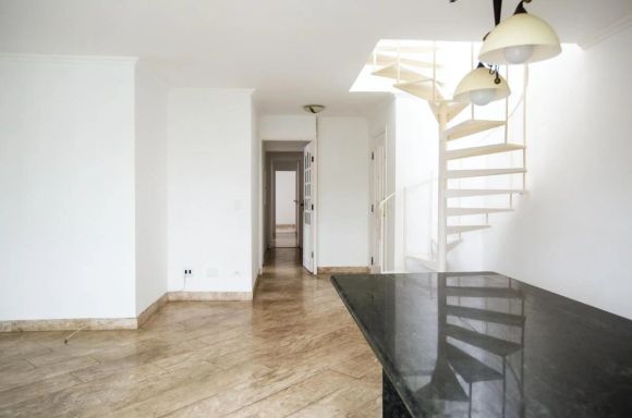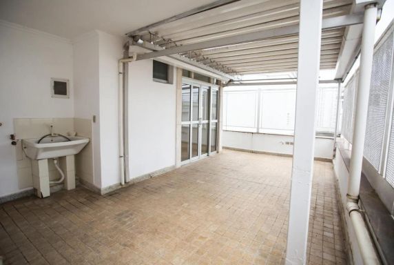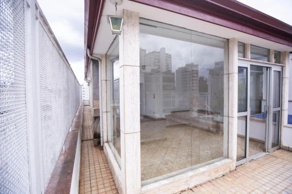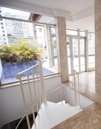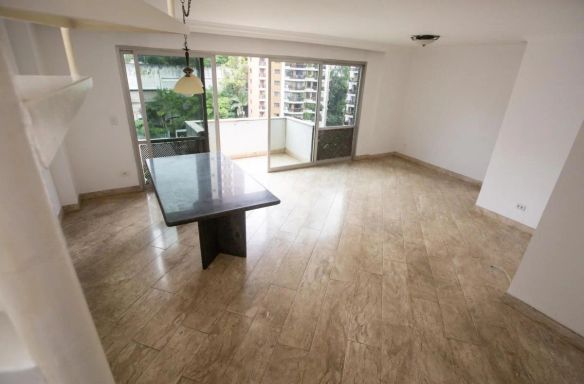 Apartamento com 250m, 4 dormitórios, sendo 2 suítes, 1 banheiro social, 1 lavabo, 1 banheiro de serviço, área de serviço, varanda e 2 vagas de garagem de planta retangular e ampla para renovação, com janelas piso teto na sala de estar, boa iluminação e área descoberta com piscina privativa. Necessita de modernização e renovação, mas possui amplitude e boa separação entre área social e íntima.